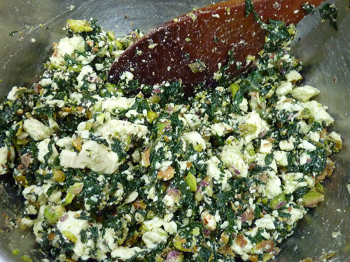 Place in a bowl with the cinnamon, cumin, pepper, feta, ricotta, pistachio and
